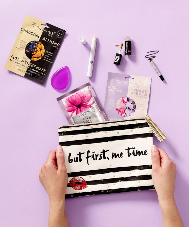 What exactly does the swag bag contain, you ask? While I don't have uberspecific details, I can tell you that it will include lip gloss, a brow pencil, eyeliner, a makeup blender, face masks and hair masks, all of which you can store in your new “But First, Me Time” cosmetic bag that will also be included. In my opinion, the most exciting part of the giveaway is the selection of face masks, since they usually cost at least $3 for a sheet mask or $8 for a small tube of clay or mud mask. Getting to try a few different ones for free is kind of like hitting the product jackpot.