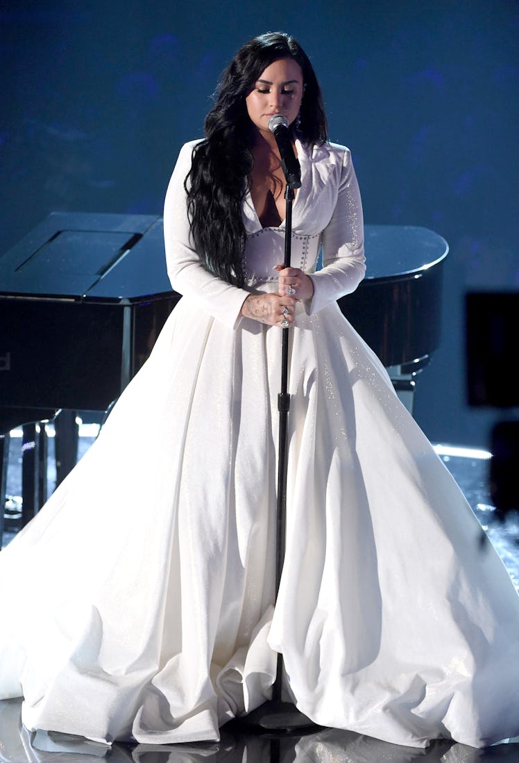 Before belting out beautiful, strong notes and illuminating the Grammys stage with talent, Lovato took a moment to restart her performance. It's clearly a very personal track for her, and this moment gave her a chance to regroup before unleashing truly heartbreaking and real lyrics. She sung of her battle with lyrics like: "I tried and tried and tried some more. Told secrets 'til my voice were sore." And she confessed that she believed that nobody was actually listening to her, with this stunning message: "I feel stupid when I sing. Nobody's listening to me."