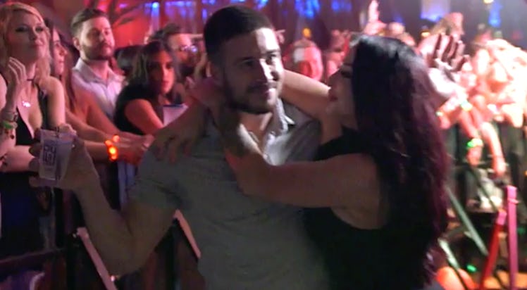 And it looks like Angelina's return won't only consist of trading insults and fists with JWoww. The teaser also hinted at a hook-up between Angelina and Vinny, as JWoww advises Angelina to hook up with Vinny again and we see a clip of Angelina kissing Vinny on the cheek before playfully pushing him away from her. As fans of the original series will recall, Angelina and Vinny actually first hooked up in the second season of Jersey Shore, but nothing ever really developed from that.