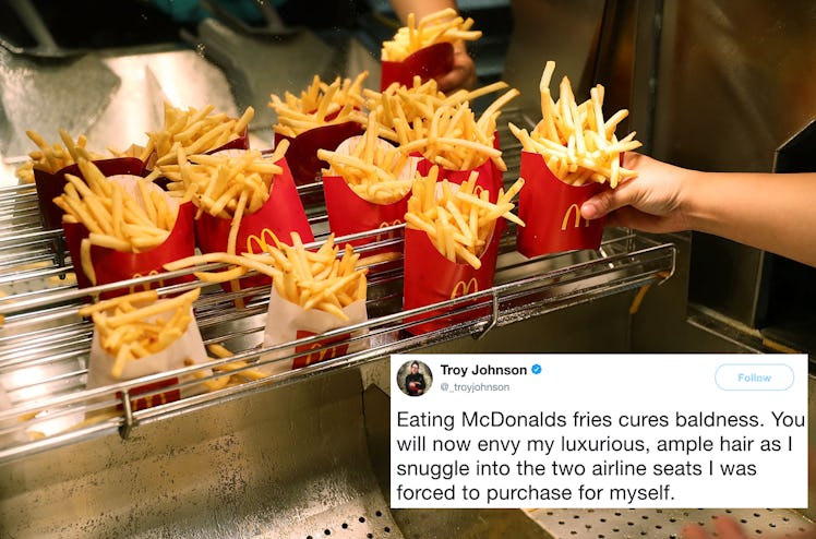 "Eating McDonalds fries cures baldness. You will now envy my luxurious, ample hair as I snuggle into the two airline seats I was forced to purchase for myself," tweeted food critic and Guy's Grocery Games judge Troy Johnson.