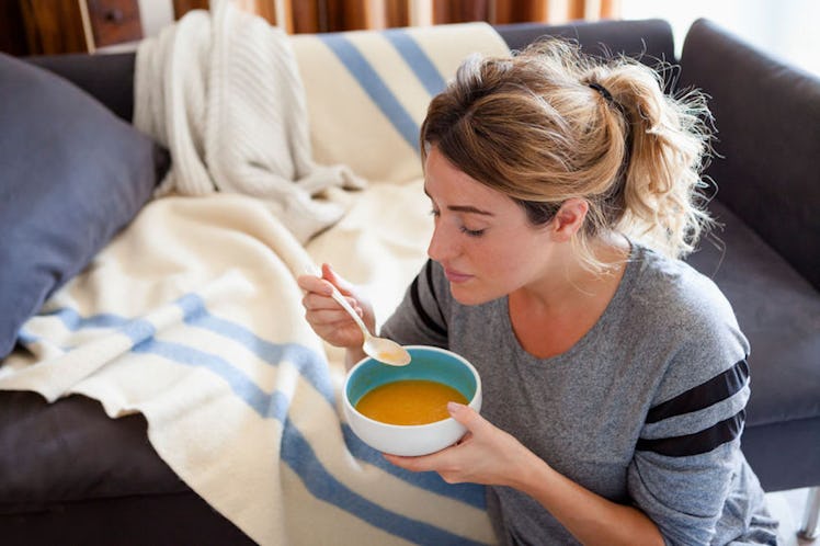 Whatever you do to soothe your sickness, make sure not to follow the old adage that prompts you to "starve a cold," says Cuda. "Food gives you the energy and nutrition to help fight infections and can help prevent you from getting sicker," she tells Elite Daily. Avoiding food will only keep you sick longer, she explains, and it can make you more likely to get sick in the future, she adds, so make sure you're treating your body to plenty of nutrient-rich foods.
