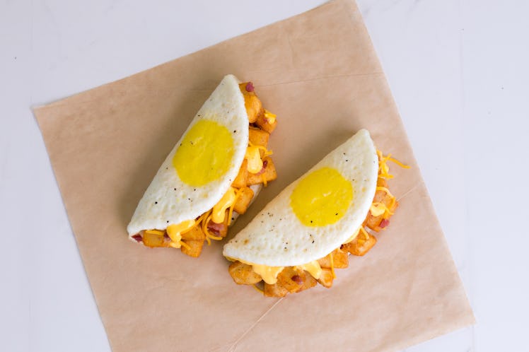 OK, I know a taco with a fried egg on the outside might sound a little disorienting, but I swear on my weekend brunch that the Naked Egg Taco will change your damn life. The snack combines all classic breakfast foods, including eggs, bacon or sausage, seasoned potatoes, and a melted medley of cheese, into the form of their signature dish: a taco. And, per a press release sent to Elite Daily by Taco Bell, the Naked Egg is coming back on March 8, for an even better deal than before. For just $3.49, taco lovers will now be able to stuff themselves with not one, but two breakfast tacos at a time, which like, I guess is what dreams are made of. I'm thrilled, seriously.
