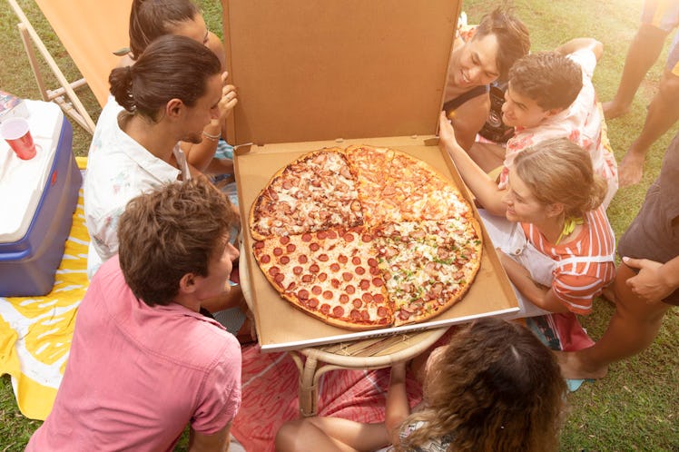 Per the press release, each pizza comes with 12 slices, but they might be the biggest slices of pizza you've ever seen. Four fully-loaded quarters of Domino’s most popular types of pizza are represented on each pie (Pepperoni, Supreme, BBQ Meatlovers and Hawaiian), which means that wherever your friends fall on the pineapple-on-pizza debate, everyone is bound to be happy. Per the press release, each one of these massive quarters is "roughly equivalent in size to two large pizzas" — a solid 40 inches across, per Delish. In other words, that's a whole lot of pizza, so you're probably going to want to call the crew to help you out with this one.