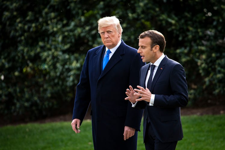 Here's some serious irony to start your week off strong. Back in April 2018, President Donald Trump met with French President Emmanuel Macron in Washington, D.C and did some gardening to solidify their "bromance." However, it looks like Donald Trump and Emmanuel Macron's friendship tree has died, according to reports. Cue eyes emoji here.
