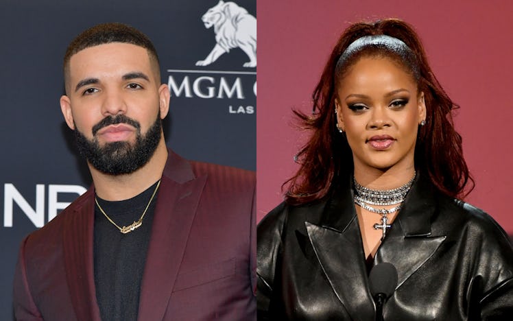 When thinking of "complicated" relationships, Drake and Rihanna immediately come to mind because it's hard to put a label on the pair. Even Rihanna doesn't know what to call her relationship with Drake. In her interview with Vogue in June 2018, Rihanna revealed, “We don’t have a friendship now, but we’re not enemies either. It is what it is." But what is that supposed to mean, exactly? Yes, fans have seen them collaborate on tracks like "Work" and "What's My Name?," but working together professionally doesn't always mean the artists involved are close. Heck, most collabs nowadays don't even require the artists to be in the same room together. So while the stars collaborate just fine through music, Drake and Rihanna's social media interactions reveal another long, complicated story.