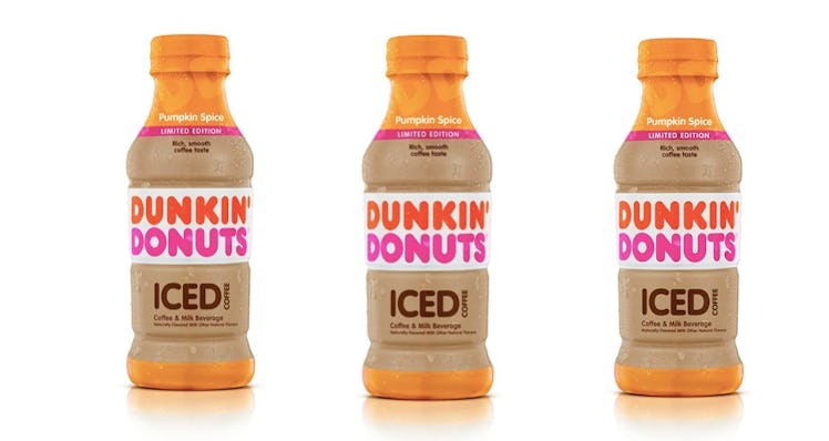 Since DD's bottled Pumpkin Spice Iced Coffee won't debut for yet another few weeks (bummer, I know), you should probably know that the brand’s entire fall menu is already available in restaurants throughout the United States, according to a press release. The in-store menu features pumpkin spice-flavored foods and beverages, and they'll definitely tide you over until the RTD coffee becomes available. Between pumpkin spice iced and hot coffee, iced and hot lattes, cappuccinos, macchiatos, and Americanos, frozen coffee, cold brew coffee, muffins, donuts, and munchkins, you definitely won't feel at a loss for pumpkin spice. If you're looking to enjoy pumpkin spice from the comfort of your own home, DD also sells pumpkin K-Cups and bagged coffee at grocery stores. It's a gourd-lovin' miracle.