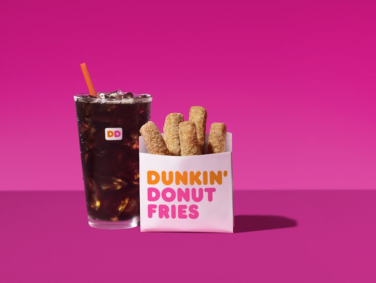 That's not all. After being tested out in Boston, Massachusetts and Providence, Rhode Island stores earlier this year and getting rave reviews (duh), Donut Fries will also be available at participating Dunkin’ Donuts locations nationwide for a limited time. In the press release, the fries are described as thin pieces of "buttery croissant style donut dough" that are fried, and then generously coated in cinnamon sugar and served hot. They look and sound just like churros with their cinnamon and sugar dusting (which is definitely not a bad thing, TBH), and five of the Donut Fries ring in at $2.