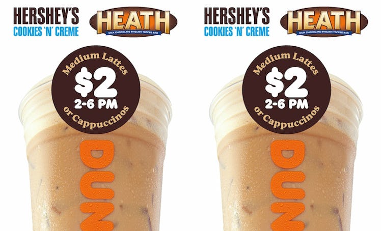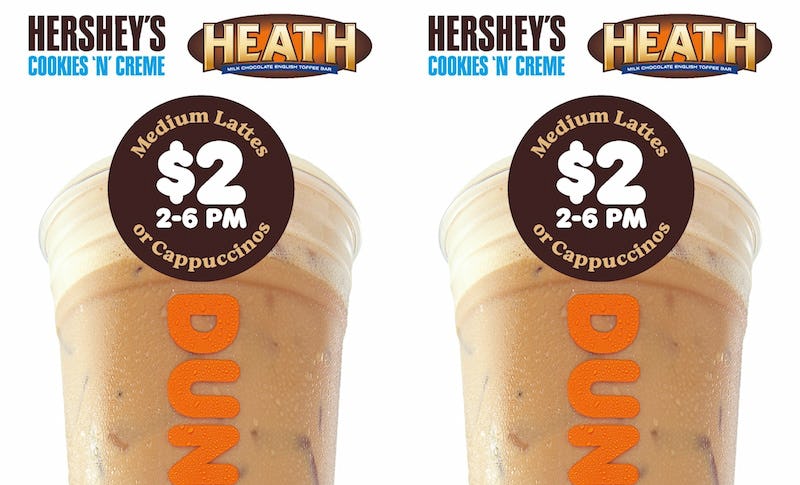 Believe it or not, Dunkin' is offering more than just its OG lattes and cappuccinos during the daily happy hours. It's also offering Hershey's Cookies 'N' Creme selections as well as Heath-flavored drinks. Therefore, if you're craving a little bit more flavor in your afternoon pick-me-up, you can opt for a candy-inspired sip.