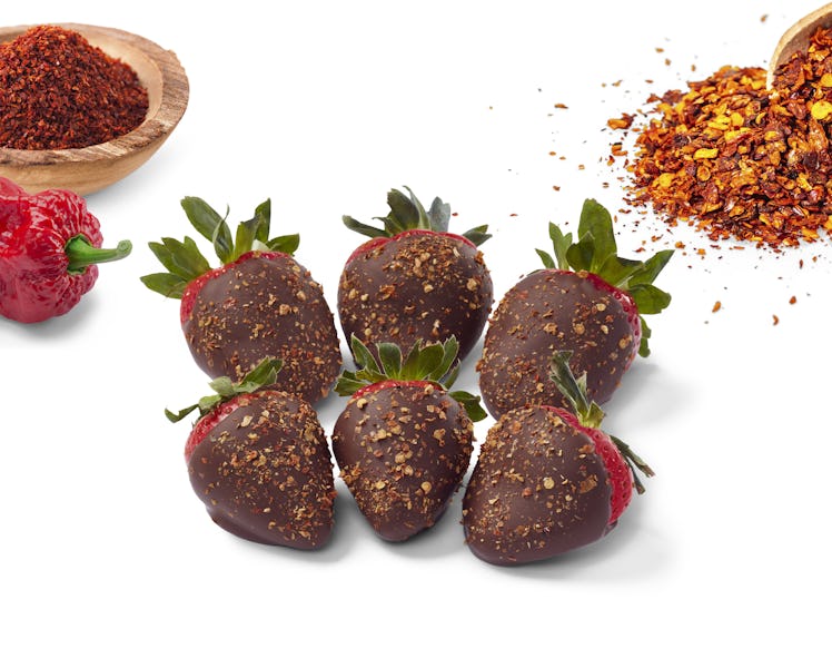 Starting on Tuesday, Feb. 10, spice devotees can tantalize their tastebuds with their choice of the "Love on Fire" box or the "Burning Love Bouquet" from Edible Arrangements, which are both a great way to show how much you care through the addicting combination of sugar and spice. The unexpected star ingredient in both boxes of treats is the ghost pepper, which is definitely an unexpected surprise. Edible Arrangements says that the spiciness of a ghost pepper is hot enough to cause your brain to release endorphins and dopamine, which it turns out, are the same chemicals your brain releases when you're in love. With these mouth-tingling assortments, you can expect to feel double the "love" with each mouthful or replicate the feel-good qualities you get when you're crushing on someone.