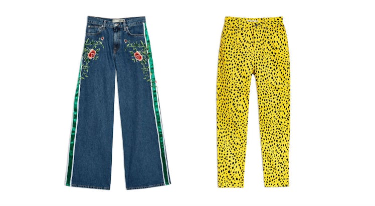 This year's trends include a few new silhouettes and cuts, but the most exciting ones are about color and pattern. Gone are the days when solid indigo in various washes reigned supreme — now, it's all about vibrancy, prints and a hodgepodge of washes. Five of fall's biggest denim trends are explained below, with shoppable options for each. There's only a month until the first day of fall (can you believe that?!) so you might as well get a head start on cozy clothes shopping now.