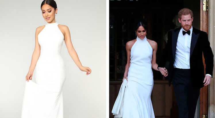 If ever a company truly devoted itself to being on top of every and any style trend, Fashion Nova undoubtedly takes the cake. If ever someone was to win an award for the fastest rise to style icon stardom, I believe Meghan Markle would beat out all the other nominees, as she has managed to become both a duchess and a messy bun/cool-girl fashion icon in a matter of just a few months. With these facts in mind, I'm hardly surprised to come across Fashion Nova's replica of Meghan Markle's reception dress, since millions of eyes were watching when Markle said "I do," and millions more took to Twitter and other social platforms to rave about her wedding day lewk — her high-necked reception gown in particular. It's too late now to channel these Markle vibes for your Halloween costume, but Fashion Nova is making it possible for you to wear a similar style to your neck formal event instead. Markle's signature messy bun not included.