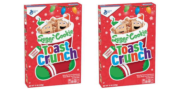 The holiday-themed cereal is coming back for a limited time, according to General Mills. The front of the red cereal box shows a stocking with little pieces of the crunchy toasts wearing red and green Santa hats. Attached to the stocking is a tag that reads "limited edition." It's unclear how long the Sugar Cookie Toast Crunch will reportedly be available for purchase, but I'll be stocking up on boxes of this sugary sweet treat ASAP.