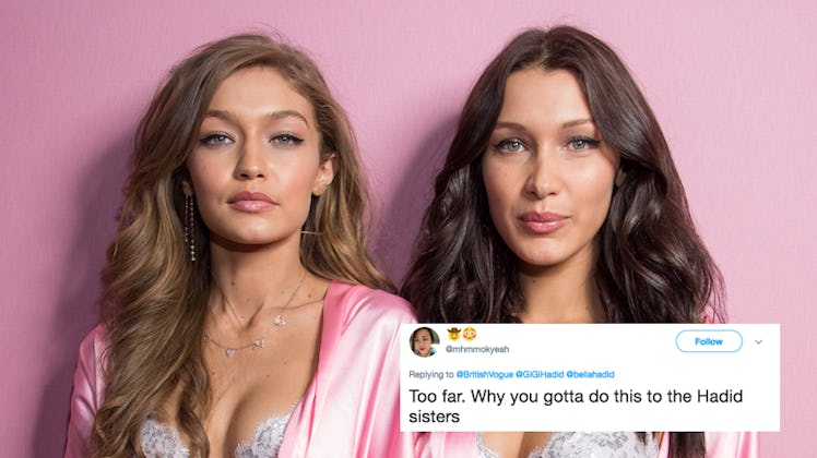 Listen, I'm not here to pick a fight. In fact, I want the exact opposite of a fight with the largest fashion magazine in the world. But, I can't protect you, Vogue, from the angry folks on Twitter. After the Hadid sisters' sultry photo was shared across social media, the magazine immediately received some serious backlash. That's because, according to fans, it sort of looks like they went a smidgen overboard with the editing.