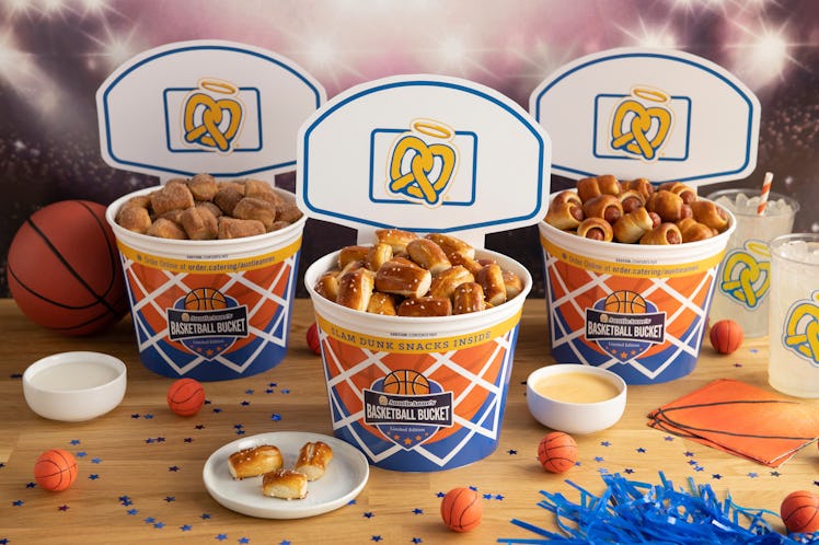 It can be tough to feed a crew of hungry sports fans, but Auntie Anne's (aka the pretzel connoisseurs that pretty much everyone knows and loves from their mall excursions) is giving even the pickiest eaters something to look forward to with two limited-edition "Basketball Buckets" brimming with your favorite pretzel-themed treats. Pretzel bites are finger food and group-friendly for sharing, and TBH, these options both sound like total slam dunks in the food department.