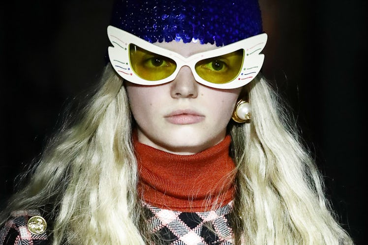 The collection showed at Rome's Capitoline Museum on May 28, offering up that kitschy cool goodness Gucci's been known for since creative director Alessandro Michele took over the brand. Lace gloves, '50s sunglasses, plaid suits, socks with metallic platforms, vintage prints, and velvet pants were among the standout pieces of the collection, but the true spotlight stealers were the ones that celebrated the female reproduced system and championed a woman's right to choose. "I am a free spirit, I have always been a free spirit born under the stars of freedom. My parents brought me up in that way and I have spent my entire life fighting for inclusion," noted Michele in an interview about the collection with WWD. "Nobody should have the right to decide about freedom of choice of any human being. No law should say to any person what to do or what not to do when it comes to very personal choices."