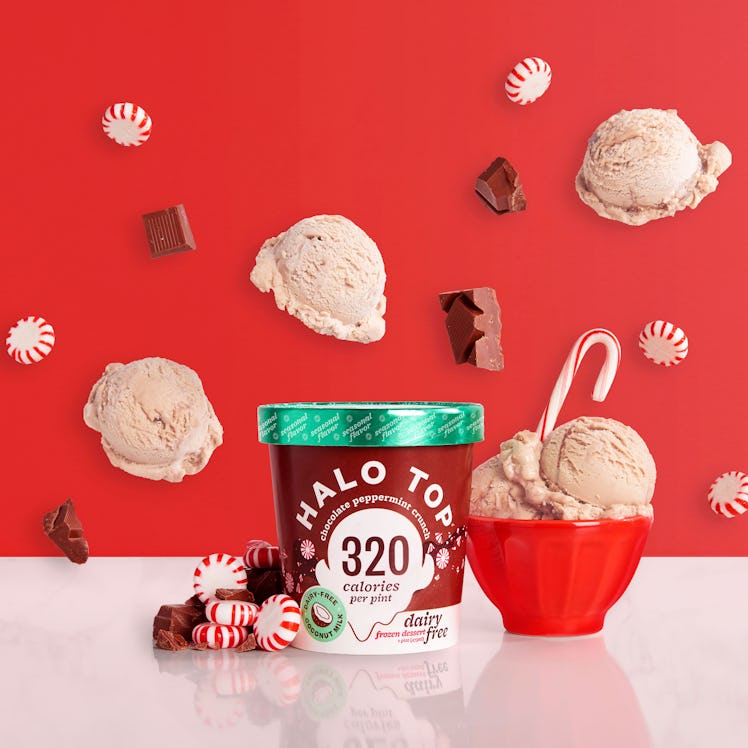 According to press materials shared with Elite Daily by email, the company announced that it would be rolling out a limited-time flavor that's basically sounds like Christmas in pint form. Forget pumpkin spiced everything, because Halo Top's Chocolate Peppermint Crunch Ice Cream is available now until the end of December, which means that you can start indulging in a taste of the holidays way before Halloween and Thanksgiving roll around.