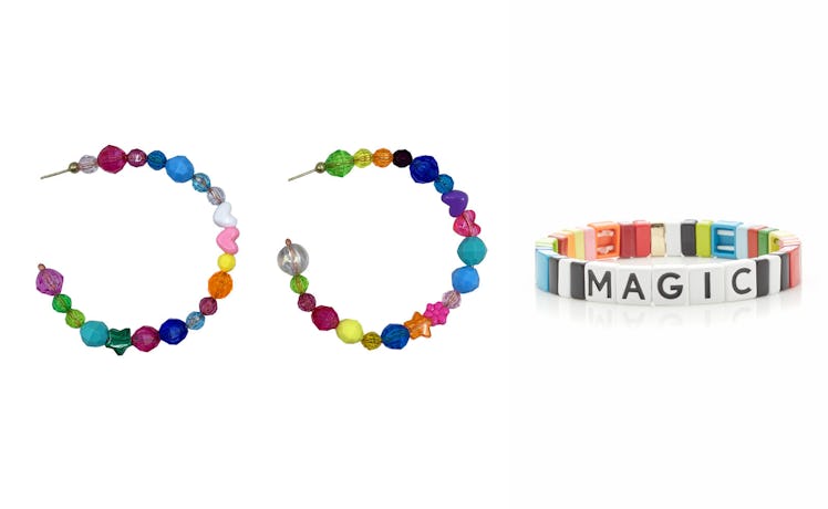 Baubles crafted from beads in hues that span the rainbow have been cropping up on seemingly every influencer, runway, and editor as of late, serving as playful accessories that add a pop of personal nostalgia to any look. They're basically exact replicas of the handmade beaded jewelry you definitely designed during your childhood, proving that kitsch, color, and handcrafts are in. Take Susan Alexandra's Joyful Hoops Jumbo or Roxanne Assoulin's Just Say It Magic Beaded Bracelet for example, which retail for $118 and $110, respectively. They both consist of technicolor beads strung onto wire or stretchy string, AKA similar materials to those you used as a kid, except rather than costing a mere $2 or $3 per piece, these retail for the same price as 20 lattes. And they're even on the more affordable end of the spectrum!