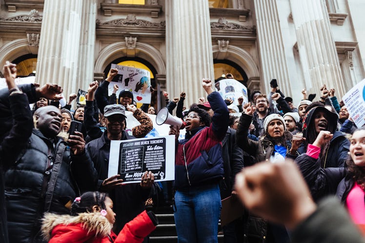 According to Logan and Youth Over Guns, which is part of New Yorkers Against Gun Violence (NYAGV), the issues of gun violence, bias, and education inequity are deeply interconnected, which is why she wants to focus on making sure that black and brown students feel safe in their classrooms. According to a 2018 study released by the U.S. Department of Education, black students made up 15% of all students across the country during the 2015-2016 school year, but accounted for 31% of students who were arrested or referred to police at school. The National Education Association attributes this disparity, at least in part, to the fact that schools have responded to shootings with additional policing and metal detectors rather than with investments in teachers, students, and local communities. The NYAGV Education Fund's ReACTION Youth Program — a gun violence prevention education program taught in New York City public schools — is a big part of Youth Over Guns' work for this reason, Logan says.