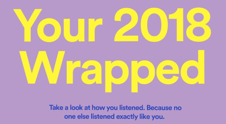 If you've been listening to Spotify for a little bit, you're probably aware that the music streaming service unleashes Spotify Wrapped at the end of every year (if you recall, they did it last year at the end of 2017). Anyway, Spotify Wrapped basically lets listeners check out any and all of their top-played songs in order, by artist, and by genres. It also shows how many minutes of music you streamed, the first song you played in 2018, and the oldest throwback rocked out to all year long. Plus, Spotify gives you a Top 100 playlist consisting of the top 100 songs you listened to (not in order), and if that isn't the most convenient way to reconnect with all your favorite jams, I don't know what is.