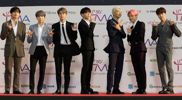 BTS is set to hit the stage at the SBS Inkigayo Super Concert on Sunday, April 28, to headline the annual K-Pop music festival alongside a stacked lineup of their K-Pop peers. Even BTS' young label mates, TXT, will be hitting the stage alongside them. Besides BTS and TXT, the lineup includes Momoland, IZ*ONE, N.Flying, NATURE, Cherry Bullet, Hong JinYoung, THE BOYZ, and TWICE. And even though the BTS ARMY has a bit of a tricky relationship with SBS Inkigayo after they inexplicably snubbed BTS on the April 21 episode of Inkigayo, fans are still wondering how to stream the SBS Inkigayo Super Concert photo wall so they don't miss out on the K-Pop stars' first appearances.
