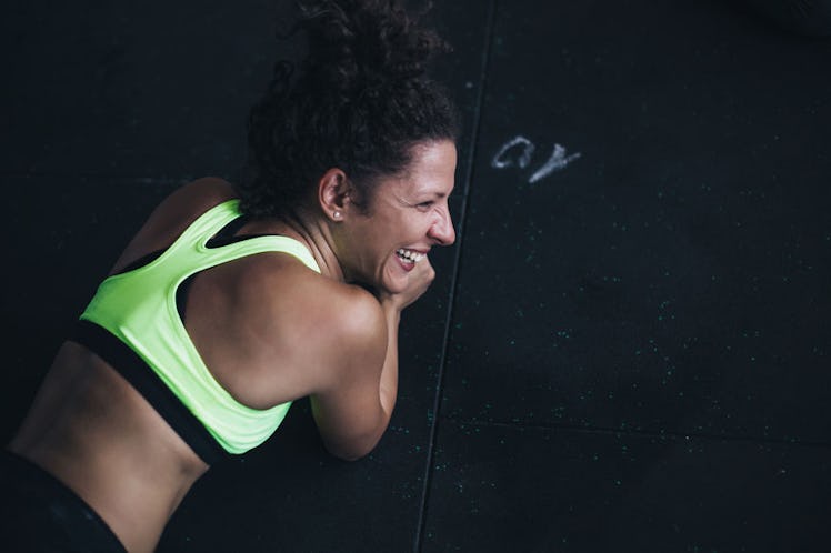 "Start on the floor and position your arms into a 90-degree angle with your forearms touching the floor, elbows positioned under your shoulders and your hands in front of you, shoulder-width apart," McNaughton tells Elite Daily over email. "Then position your legs by stepping your feet back, maintaining a straight line from head to toe. To align your spine, be sure to keep your face looking down." Tighten your core for as long as you can before releasing and dropping to the floor, she says. She suggests repeating this 10 to 15 times for four sets.