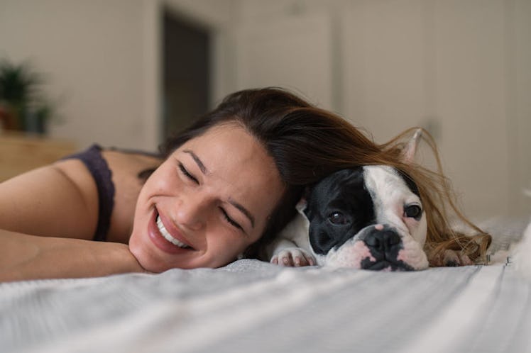 A study of 962 women, published in Anthrozoös, a multidisciplinary journal that explores the interactions between people and animals, proved once and for all my long-held claim that pups make the best snugglers. The researchers surveyed the women about their general sleep habits, and while they found that cats and human partners alike both disturbed the participants' sleep in more or less the same way, dogs pulled through as the real champions by being less likely to wake their owners throughout the night. The participants also reported "stronger feelings of comfort and security" from snuggling up with their canine cuddle buddies compared to feline or human companions, as per the research paper.
