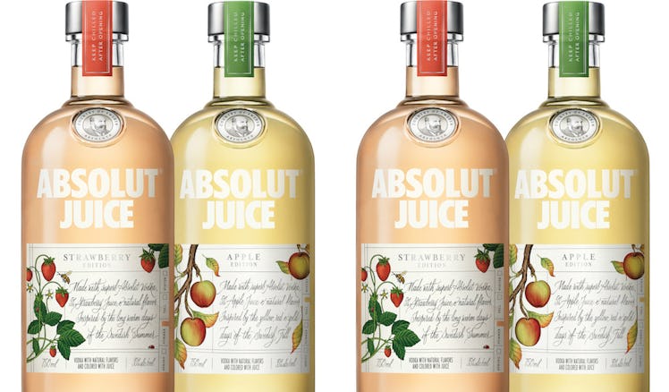 If you haven't already heard about Absolut Juice, it's one of the latest and greatest products to come from Swedish vodka giant Absolut. According to an email from the brand, a bottle of Absolut Juice has a slightly lower ABV than the average bottle of vodka, featuring 5% real fruit juice and 35% ABV, which makes for a refreshing and well-balanced sweet flavor. In small amounts, you can sip it chilled all by itself, or the brand recommends mixing it with a little bit of soda water and a hefty handful of ice for a bubbly craft cocktail. And while simply enjoying it is bound to be easy, choosing between the two flavors, Apple and Strawberry, will undeniably be the hardest part.