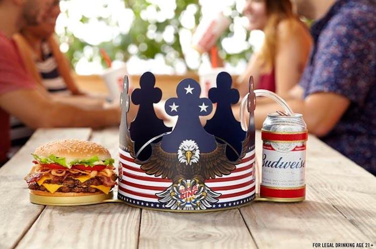 In addition to rolling out the limited-edition "Freedom Crown," Burger King is also cooking up a brand new burger called the American Brewhouse King Sandwich. This bad boy is composed of "two savory flame-grilled beef patties totaling more than a quarter-pound of beef, topped with three half-strips of thick-cut smoked bacon, crispy onions, tavern sauce, American cheese and creamy mayonnaise all on a sesame seed bun," according to Burger King. You can also get this delicious monstrosity for $6.19 at participating BK locations.