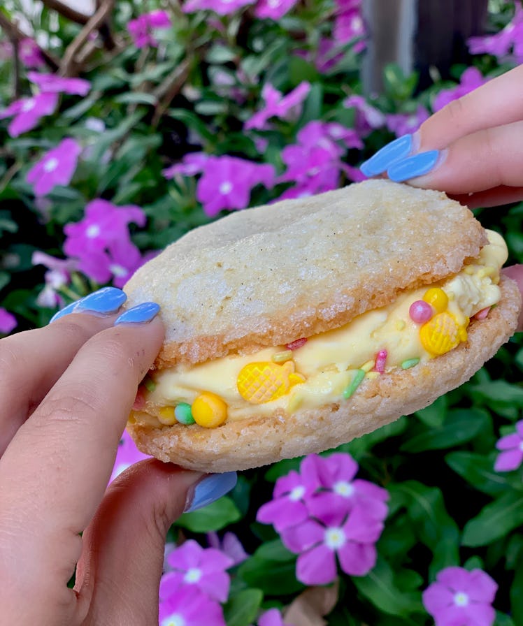 According to blogger Disney Food Blog, the counter service portion of Wine Bar George (which is called The Basket) will be dishing up the confections, which feature two sugar cookies sandwiching a sorbet-inspired blend of pineapple Dole Whip, sweet Moscato wine, and vodka. Per an image of the treat, it also looks like it's decorated with colorful sprinkles and candies, making it perfect for the 'Gram. The best part? It's just $8 per sandwich, which is honestly a steal for getting a buzz while handling your sugar cookie and Dole Whip cravings in one tasty treat.