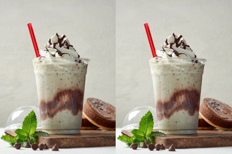 If you want something closer to ice cream than a shake, definitely try Dairy Queen's Blizzard of the month, the Mint Oreo Blizzard. This thick, velvety ice cream treat is bright green to celebrate St. Patrick's Day and is made with a mix of real Oreo cookie pieces, crème de menthe, and DQ vanilla soft serve. You can snag one of these festive blizzards for a limited time in mini, small, medium, and large sizes, according to Dairy Queen.