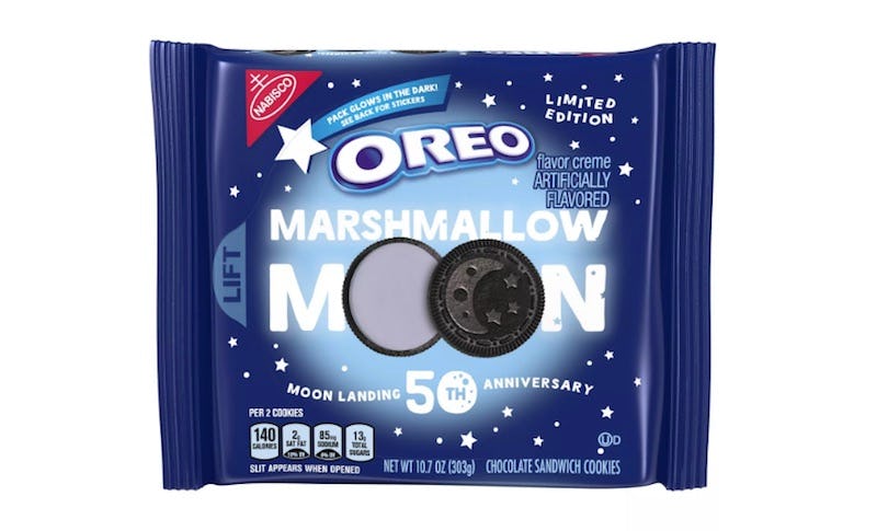 Speaking of being in stock, let's talk about the Marshmallow Moon Oreo's availability. ICYMI, the stellar Oreo cookies were released for summer 2019 alongside two other flavors: S'mores Oreos and Baskin-Robbins Mint Chocolate Chip Oreos. Unfortunately, all three flavors were only released for a limited time, which means Marshmallow Moon Oreos might not be on the shelves for too much longer. With that being said, head to Target or Walmart and buy a few packages while they're still on the shelves.