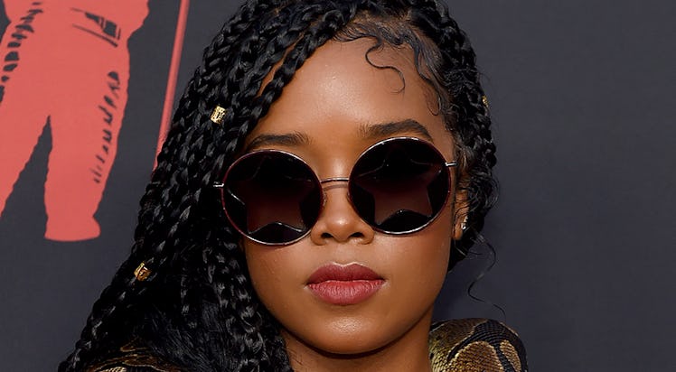 H.E.R. received three nominations for the 2019 Video Music Awards: Best New Artist, Push Artist, and Best R&B Video for her song, "Could've Been." Obvi, she had to slay the red carpet in celebration, so that win or lose, she could look back on a fab outfit and feel proud. Personally, I think her bold jumpsuit, beautiful braids, and oversized shades would've been Mission Accomplished, but H.E.R. chose to up the ante and take things a step further, and she finished off her look with a literal snake.