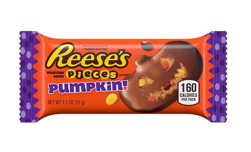 I'll start with the new "Reese's Stuffed with Pieces Pumpkin." This selection takes the original Reese's Peanut Butter Pumpkin to the next level, because it's literally stuffed with Reese's Pieces. According to Hershey, you'll be able to grab a bag of these spooky treats nationwide for a limited time, too.