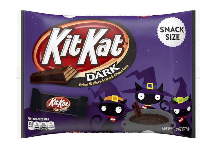 So, when I saw that Hershey's is now bringing their darkest offering to Halloween town, I knew I was in for quite the treat. As of Wednesday, Aug. 22, Hershey's newest's Halloween Kit Kat is available for a limited time inside a super cool 9.8-ounce snack-size package, which I'm totally obsessed with. Against a moody dark purple background, three black cats (or Kats, if you will) wearing witches' hats on their heads can be seen circling a cauldron and plotting world domination. In this case, I'd assumer they're probably planning how to take over the world — one dark chocolate Kit Kat at a time.