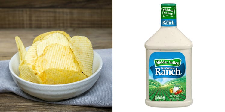 Ranch is the king of dressings, hands down. Everyone knows that the versatile sauce perfectly coats veggies and cuts the spice on your favorite buffalo wings — but it’s also a way of life for people who drizzle it over their pizza, mozzarella sticks, and fries. Like, ranch fountains actually exist, and I'm not mad about it. Honestly, what doesn’t taste better dunked in some creamy and tangy ranch dressing? That's why the ranch fanbase's new snacks du jour, Hidden Valley's ranch-flavored chips and popcorn, are such game changers.