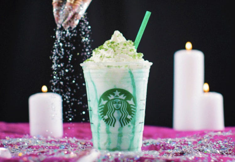 So, why is making the drink such a process? Apparently, there's a few key steps and ingredients that make the Crystal Ball Frappuccino so special. According to Starbucks, the new frappuccino is made with a crème peach-flavored base (yum). Then, the base is mixed with a turquoise swirl, which definitely adds to the elusive "crystal ball" vibes. Of course, the drink is topped with whipped cream, and then sprinkled with rock-candy crystals. The rock-candy crystals come in three colors, and each one has an adorable meaning: blue is for adventure, green is for good luck, and purple is for magic, wonder, and enchantment. The exciting part about ordering one is that customers don't know which color crystals they'll get!