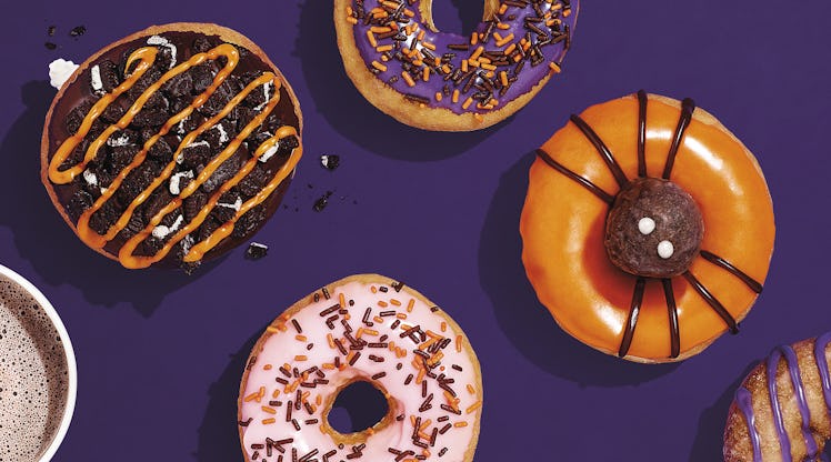On Oct. 3, Dunkin' Donuts revealed that it is giving several of its beloved pastries a spooky makeover that expertly toes the line between scary-good and too cute to eat, per a press release. While all the classic donuts you know and love are reportedly "dressing up" in the colors of the season, fans will definitely be salivating over the return of the Spider Donut, which will be available at participating Dunkin' locations through Oct. 31. ICYMI last year, the adorable eight-legged confection features a spider — made out of chocolate and white icing and a glazed chocolate Munchkins donut hole — sitting atop an orange icing-glazed donut, and it's just begging to be eaten. Trust me, this treat will haunt your dreams in a good way.