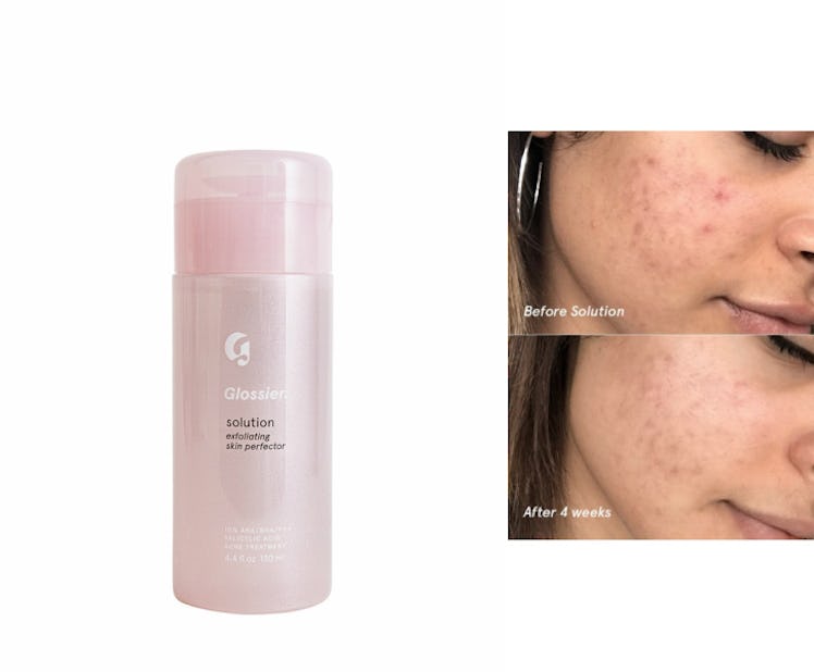 Solution, which Glossier calls a “skin perfector,” will do a number of things for your skin. In the process of chemically exfoliating (more on that in a minute), it will also clear acne, minimize pores, and even tone and texture. So basically, it will give you the glowy skin that dermal dreams are made of.