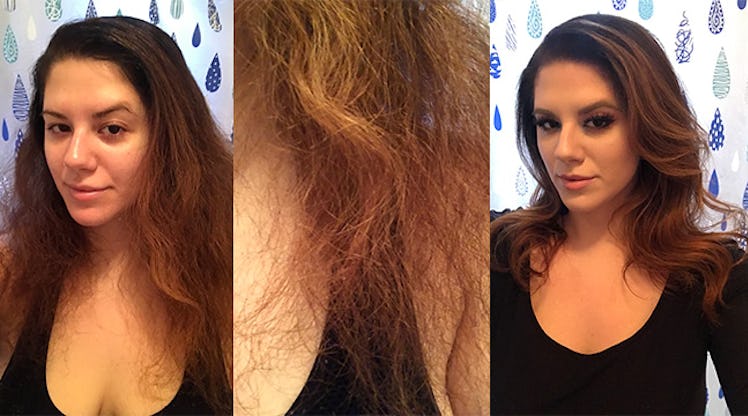 While my hair was dry, Avanzino cut off the ends and revealed much healthier hair. Avanzino explained that once hair begins to split, it will continued to split all the way up the strand (resulting in thin, brittle looking hair) if you let it. Once you notice your ends split, that's when you should make a sensible trip to your fave hairstylist.