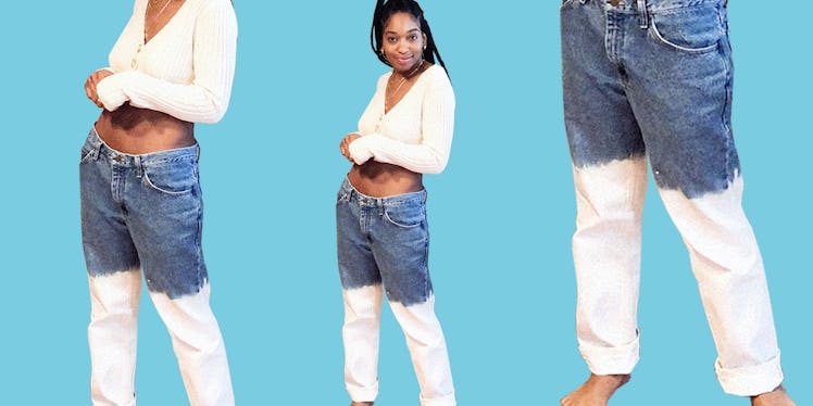 Behind the ever-popular tie-dye trend, dip-dyed or bleach-washed denim is pacing to be one of summer 2020's hottest fashion trends. Accomplished with just bleach, water, and a pair of denim jeans (or any other denim clothing item, TBH), this style is easy to duplicate, and the materials used can likely already be found in your home. Not to mention, as the ongoing coronavirus pandemic will force most summer activities to be conducted within the safe confines of your home or backyard, it's prime time to let your creative juices flow. As for me, I’m an avid vintage shopper, and I love worn-in denim so much that I probably own at least 20 pairs of vintage jeans. That said, bleaching your jeans is an inventive way to upcycle denim, save money, and make a one of a kind item. So, with a free afternoon and a pair of jeans to spare, I tried the dip-dyed denim trend myself.