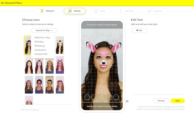 Once you've perfected your Lens rivaling the likes of the adorable Snapchat Puppy, you'll enter the time and location for when and where you want your Lens available (say, your upcoming Galentine's Day bash). The customizable Lens is perfect for any size gathering because you can cover anywhere from 20,000 to 5 million square feet, which means you're covered from small events all the way to big bashes up to the size of a few city blocks.