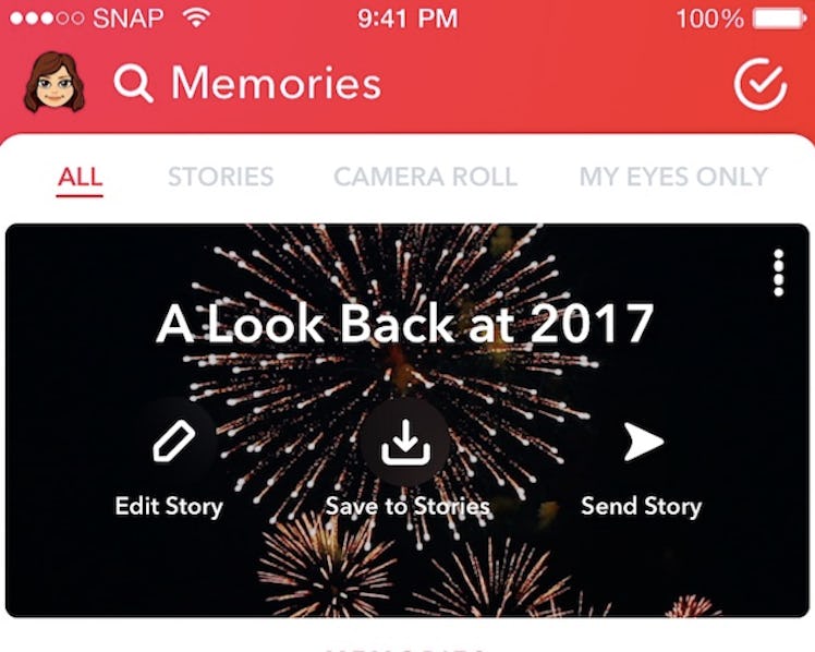 Taking stock of the year you're about to put behind you is a good way to prepare for the new year ahead. Thankfully, Snapchat is making it easy for you to recall your favorite photo memories. On Wednesday, Dec. 27, the app is launching a personalized "2017 Story" for each of its users that utilizes the Memories feature. If you're not familiar, the Memories feature is where your Snap photos and videos go when you save them.