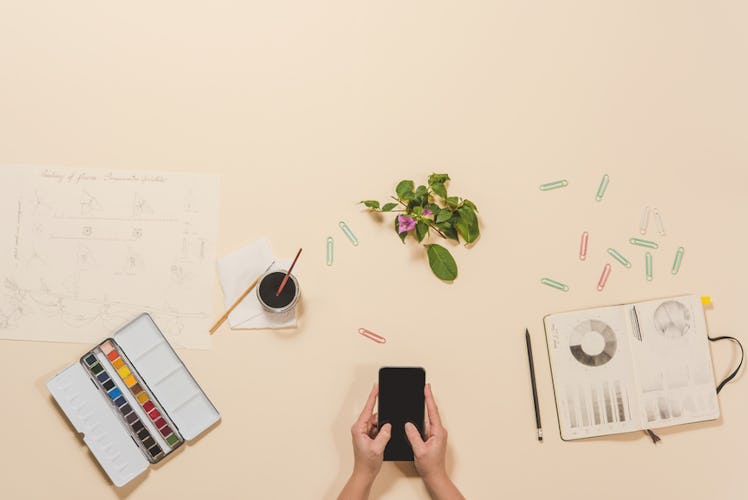 Unless your brain only works via a series of sticky notes, try keeping your desk as minimalist as possible, allowing you to move through your workday without feeling totally overwhelmed by the clutter. Or keep it totally messy, if that's what makes you feel better! It's all about finding the environment that makes you feel best as you work.