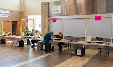 Whether you're voting early or on Election Day, you should ensure that you maintain at least six feet of distance between yourself and other voters, both in line and at the voting booths. Vincent Racaniello, Ph.D, a microbiology and immunology professor at Columbia University's Irving Medical Center, tells Elite Daily that large groups of people can be a risk.