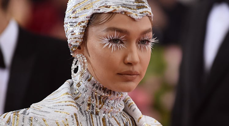 Another personal fave? Gigi Hadid's white hot lash look. While I daresay her Michael Kors sequined Liberace and Cher-inspired jumpsuit missed the camp mark for me, her lashes were on point. Makeup artist Erin Parsons was responsible for Hadid's beat, and used Maybelline products for an understated, monochromatic nude look, so that the lashes could really have their moment. On her Instagram, Parsons was quick to share the deets: "They looked spiky and dangerous but were literally and physically light as a FEATHER!" she wrote of the white falsies on Hadid.