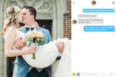 I have mixed feelings about marriage. Most days, I think I'm not cut out for it, but for silly reasons. "I like having my own closet space and bathroom sink," I rationalize, knowing fully well these are minor fixes on any HGTV home improvement show. But, other days, I feel more strongly about my disinterest. I'm uncomfortable with the grandeur of most wedding traditions. Plus, the thought of signing a contract that legally binds me to another human being "for better or for worse" is my personal hell. Obviously, I asked my Tinder matches if they wanted to get married because LOL, why not?