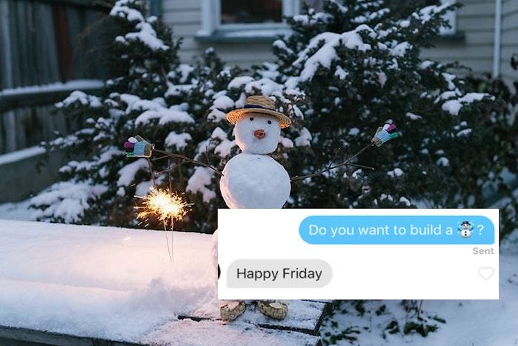 If you live in Northeastern United States and you have had to leave the warmth of your home within the past 24 hours, you're probably pretty grumpy. Same — it's cold and windy out there. I am also extra grumpy because I refuse to call this winter storm a "bomb cyclone." The term feels overdramatic and makes me think of a tornado cone made up of bomb emojis or a title for a scary episode of Black Mirror. In order to reverse my curmudgeonly ways, I asked my Tinder matches to build a snowman, and they, surprisingly, replied.