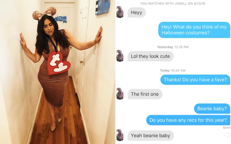 So I signed onto Tinder, set all of my pictures to Halloween costumes of years past, and got to swiping. People immediately commented that I'm super into Halloween. Which, to be fair, I guess I would think too if I saw someone's Tinder profile filled solely with Halloween costumes. I'm into it an average amount I'd say, since I like dressing up, eating candy, and watching spooky movies. They said they liked my costumes, and I asked which one was their favorite, as well if they had any costume inspiration for this year. For the most part, it surprised me that people went with the Beanie Baby costume most often as their favorite. In my mind, the devil costume seems a bit "sexier," but maybe people like the creative aspect and effort into the Beanie Baby outfit after all.