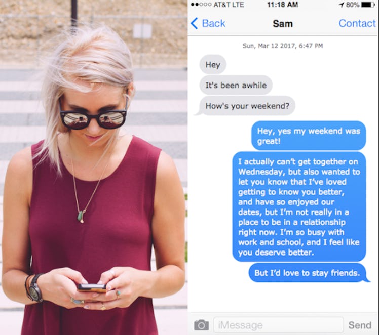Hey, yes my weekend was great! I actually can’t get together on Wednesday, but also wanted to let you know that I’ve loved getting to know you better, and have so enjoyed our dates, but I’m not really in a place to be in a relationship right now. I’m so busy with work and school, and I feel like you deserve better. But I’d love to stay friends.