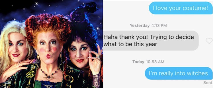 Fall weather is finally here, which means I can actually get in the Halloween spirit. After going apple picking in 80-degree weather, I'm ready to don my Ugg boots, light a pumpkin-scented candle, and snuggle up under blankets to watch Halloween movies from the '90s. Of course, this is much more fun when done with someone by your side. So, in the spirit of Halloween (and in advance of cuffing season), I decided to combine my extensive knowledge of the Walt Disney Pictures classic Hocus Pocus with my talent for Tinder-ing. I messaged Tinder matches with lines from Hocus Pocus, because 'tis the season for magic and mischief.